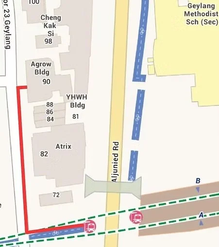 Follow this path from Aljunied MRT (Exit B) to Agrow Building. At Agrow Building, take the lift to Level 4. Lift lobby is located at middle of building.